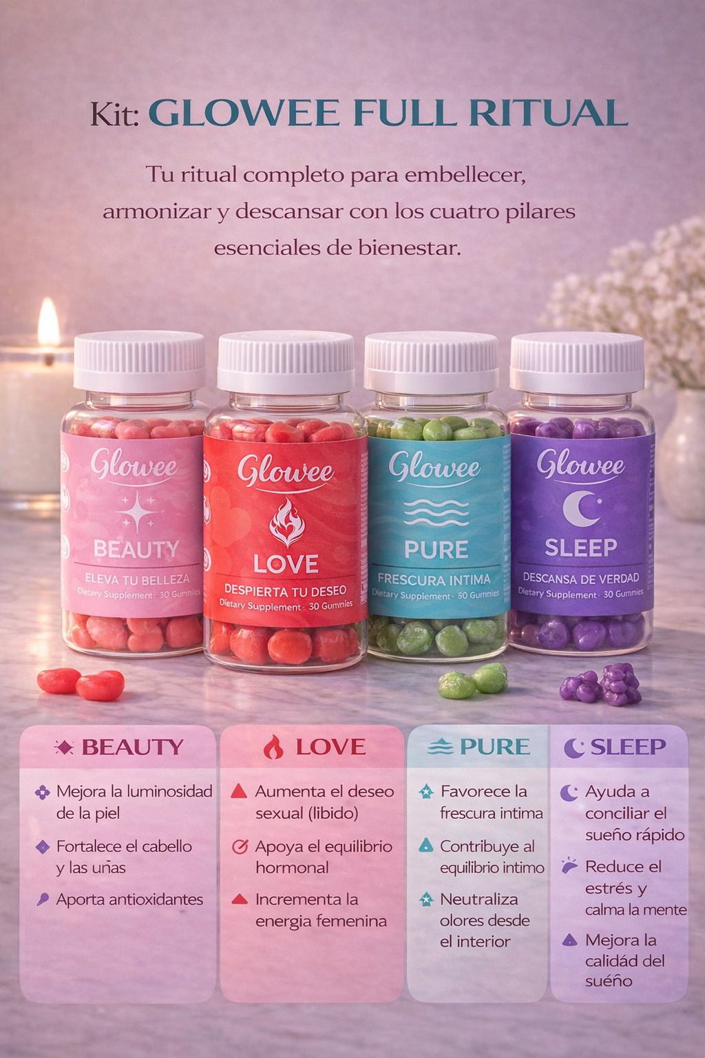 El Glowee Full Ritual reĆŗne las 4 fórmulas esenciales para elevar tu bienestar, tu energĆa y tu confianza desde adentro hacia afuera.